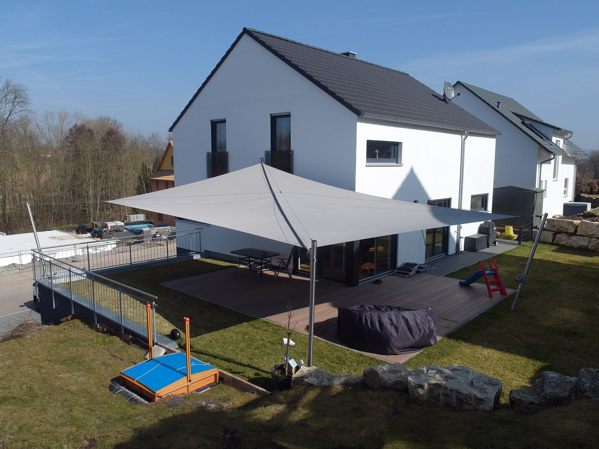 Das Sonnensegel wird hierbei über ein am Mast installiertes Schienensystem individuell in der Höhe positioniert.